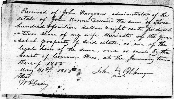 Received of John Hargrove administrator of the estate of John Brown Deceased the sum of three hundred & fourteen Dollars and eight cents, the distributive share of my wife Mariatta of the personal property of the said estate, as one of the legal heirs of the same, and as made by the Court of Common Pleas, at the January term thereof 1855